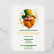 A fabulous AI graphic featuring the smiling face of an adult leprechaun man wearing a mottled orange and gold top hat that is surrounded by gold coins. The illustration is set against a white background that has green text templates and a gold "St Patrick's Day" decorative font. Celebrate the 17th of March with this modern and festive Irish design.