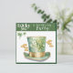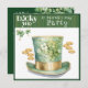 A cute leprechaun hat covered in clovers and surrounded by gold coins adorns the front of this St Patrick's Day Party invitation. Two clovers with gold drops hang from the top of the card. The revers of the card has more clovers and a place to customise all of your St Paddy's Day celebration information.