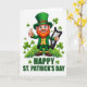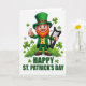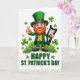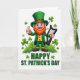 This greeting card features a cheerful leprechaun centered on a bright white background, dressed head to toe in rich green with a tall hat and a shiny buckle. His fiery orange beard and mustache frame a wide smile, with rosy cheeks and sparkling green eyes that feel like a friendly wink 💚. One hand lifts a thumbs-up while the other holds a small black harp close to his side, as if he’s about to play a tune for someone he likes. At his feet, a thick patch of green shamrocks spreads like a soft carpet, and more clovers float upward into the open space ☘️. The green outfit and clover shapes create a cozy, lucky setting that suggests an easy closeness, like sharing a private joke on a holiday. Along the lower third, the message “HAPPY ST. PATRICK’S DAY” sits in emerald green, set in large, easy-to-read letters. The final detail is the scattering of individual shamrocks rising above the leprechaun, spaced across the white background like little green confetti.