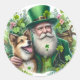 Sweet picture of a leprechaun holding a dog, is featured on this round sticker for St. Patrick's Day. This sticker can be used for St. Patrick's Day mailings, decorating, scrapbooking and more!