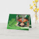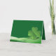 Two miniatures of Leprechauns + four-leaf clover + stylised green hills + St Patrick's Day. Design on horizontal greeting card with texts to customise inside with the same clover and hills.