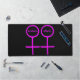 This awesome desk mat is designed for lesbians. It features two pink female symbols standing side by side. The background is black and there is customisable pink text inside each of the symbols to put names.