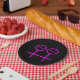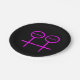 This awesome paper party plate is designed for lesbians. It features two pink female symbols standing side by side. The background is black and there is customisable pink text inside each of the symbols to put names.