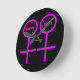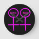 This awesome clock is designed for lesbians. It features two pink female symbols standing side by side. The background is black and there is customizable pink text inside each of the symbols to put names.