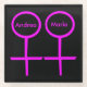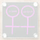 This awesome glass coaster is designed for lesbians. It features two pink female symbols standing side by side. The background is black and there is customisable pink text inside each of the symbols to put names.