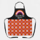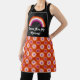 Women's apron with an image of a lesbian pride flag and a rainbow, and repeating seamless flower pattern; pink, white, and orange design on a black background, with a customisable text template for your own name or message