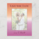 Lesbian wedding save the date postcard for two brides featuring the lesbian pride flag gradient—soft pink blending to warm orange—with photo and framed design. The front showcases your favorite engagement or pre-wedding photo framed by an elegant gradient border, with your names and "Save the Date" in script at the bottom. The back features a clean postcard layout with your personalized message, wedding date, location, and wedding website URL, plus space for guest address and postage. Convenient, eco-friendly, and cost-effective—no envelopes needed. Perfect for two brides who want a simple mailing solution that reflects their love and pride. All text elements are fully editable. For customization support, please email: remidevandesigns@gmail.com LoveOutLoudStudio©.