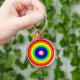 This lovely keychain is designed for lesbians. It features a round rainbow with two little pink female symbols, standing side by side in the centre of the rainbow.