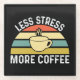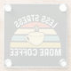Anyone who loves coffee and knows the effect it has on their stress level will love this retro style coffee design on bags, mugs, stickers, T-shirts, pillows, and more featuring a steaming cup of coffee design with text that reads Less Stress More Coffee!