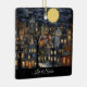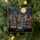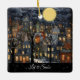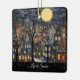Vintage illustration of a city of quaint buildings at night with LET IT SNOW text. Public domain image.