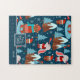 Add a cute seasonal touch to your holiday game collection with this adorable custom blue and white jigsaw puzzle. Puzzle has a pattern of a festive brown bear ice skating, an owl wearing a Santa hat and glasses, a bird on a snowy mountain, a bunny playing a trumpet, and Christmas trees in the snow. Centre text says I don't know let it snow. Add your family last name or a first name for a personalised touch.