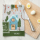 Add a cute seasonal touch to your holiday baking and cooking with this adorable custom green and white kitchen towel. Towel has a pattern of a festive reindeer in a cozy sweater, a bird, houses, holly berries, and Christmas trees in the snow. Center text says I don't know let it snow. Add your family last name for a personalized touch.