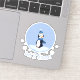 A penguin wearing a blue hat and scarf stands in the snow and watches the snowflakes fall.