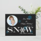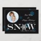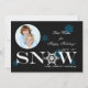 A non-deniminational holiday card featuring blue and white snowflakes, the word "Snow" and a round photo window against a black background.