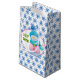 This happy snowman is ready for a cold winter with his blue knit hat and scarf. Set against a background of dark blue snowflakes, this snowman stays extra warm with a pink sweater. The text "LET IT SNOW" can be personalised. Gift bags are available in large, medium and small.