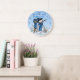 This festive Let It Snow Snowman Round Wall Clock features a snow scene background with falling snow, snow covered pine trees, a child on a stool putting the finishing touches on his snowman. The child is dressed in blue and the snowman has a blue scarf and black top hat. There is a reindeer looking on by the pine trees. Snow covered blue text is Let It Snow! Perfect for any room in your home or office. Clock numbers can be deleted if you prefer your clock without them. Also makes a wonderful Christmas gift! Matching items include; pillows, dinner & cocktail napkins, place mats, kitchen towels, tiles/trivets, coaster set, mugs, pitcher, teapot, candy jars, lamps and more are also available in our shop.
