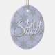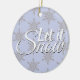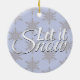 This Let it Snow Winter Snowflake Ornament is a festive decoration for a Christmas tree. It features a grey snowflake pattern on a periwinkle background with the phrase 'Let it Snow' in a white cursive script. Let this ornament create some holiday cheer.