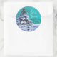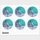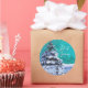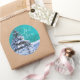 Snow laden evergreen in the snowfall. Says"Let it snow". Colours in turquoise, blues, green and white. Personalisation is optional.