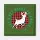 A white stag for the Christmas Holiday on a buffalo plaid circle with the words “Let’s get ready to jingle”.