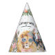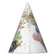 Party hat featuring a watercolor party animal design with a lion, jungle elements, and colorful confetti accents.