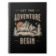 Retro style grunge illustration with "Let the adventure begin" text, sunset, mountains and birds decoration for everybody who likes nature and hiking