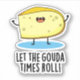 Let The Gouda Times Roll Funny Cheese Pun features a cute wedge of gouda cheese ready to let the good times roll . Perfect pun gift for family and friends who love cute cheese puns.