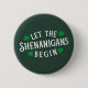 cute let the shenanigans begin green button, funny quote design perfect for st patricks day celebration party!
