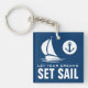 Let your dreams set sail nautical quote navy blue Keychain gift. Cool maritime gift with inspirational quote, sailboat and ship anchorlogo. Get one for friends, boating enthusiast, boat captain, skipper, fisher or sailor. Nautical theme design. Navy blue and white colours.