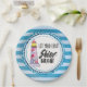 Paper plates with a blue striped pattern. A blue nautical themed circle in the centre. A red striped lighthouse with the typography text which reads: Let your light shine bright.