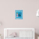 A poster with a blue striped pattern. A blue frame with a yellow border layered over top with a watercolor image of a red striped lighthouse inside. Typography text reads: Let your light shine bright.