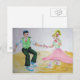 A pair of rock 'n' roll or swing dancers. A girl wearing a poodle skirt, white bobby socks, saddle shoes a green stripes t shirt and pink ribbon in her pony tail. A teddy boy with a DA haircut green waistcoat / vest with pink neck tie and dark green trousers
