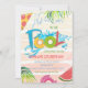 Summer Invitation for Pool Birthday Party with Sand, Splashes, Watermelon and Tropical Leaves.