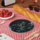 A modern, stylish and glamourous birthday paper plate. This design features a vibrant typography "Let's Celebrate" with blue gradient bokeh on a black background. Personalise and add your party details. Make your milestone birthday an extraordinary event!