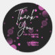 A modern, stylish and glamourous thank-you sticker. This design features a vibrant typography "Thank You" with pink gradient bokeh on a black background. Personalise it with your text.
