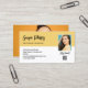 White, black, and yellow business card for any profession with your QR code, profile photo and, on the back, another photo. Content creator business card with a charming brush script, yellow accent colour, and your QR code.