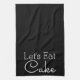 Modern black kitchen towel with the words "let's eat cake" in whitelettering.