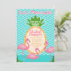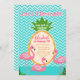 Celebrate a tropical birthday with this adorable paradise birthday invitation! Features cute pink flamingos, pineapple frame, and a turquoise/blue chevron background.