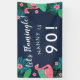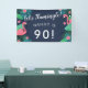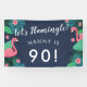 Flamingo birthday party banner with an illustration of pink flamingos, palm leaves, palm fronds, and flowers, and charming fonts against a deep blue background. Add the name and the age of the person celebrating their birthday.