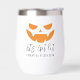 Personalise these spooky wine tumblers to create a perfect Halloween party favour. Design features an orange jack o'lantern face with two lines of custom text beneath; shown with "let's get lit" and your Halloween party name and year.