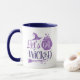 Adding to the mug's charm, a purple witch's hat, cauldron, and broom adorn the surface, evoking the iconic symbols of spellcasting and enchantment. These whimsical illustrations capture the essence of playful witchery and the excitement that comes with embracing the supernatural.