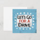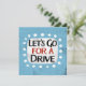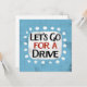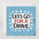 "Let's Go For A Drive" is a cute text design in light blue with black and red text, along with a white accent shape and white textured whimsical dots surrounding it.