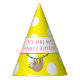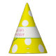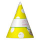 This fun party sloth is sporting a yellow and white polka dot hat and hanging from a vine. That same yellow and white polka dot design is also on this fun party hat. Easily change the text or wording to fit your occasion.