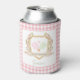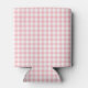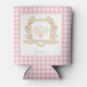 Impress your guests with these beautiful custom pickleball can coolers. These coolers have a watercolor image of a crest surrounded by branches with green and pink gingham pickleball paddles in the centre. There is a pink gingham pattern background. Text says "Let's Hit the Court." Colours used include moss green, blush pink and and tan. You can personalise with a name.