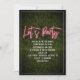 Pink neon inspired "Let's Party" script over boxwood greenery background with custom white text.