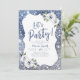 Faux sparkle silver and blue glitter "let's party" script with dusty blue and white floral, elegant and stylish, great invitations for birthday party, holiday party, engagement party or other special occasions.