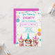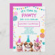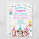Adorable girls "lets pawty" cute puppy birthday invitations. Colours are vibrant with teal and pinks and colourful balloons.