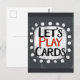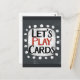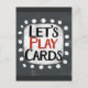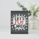 "Let's Play Cards" is a cute text design in grey with black and red text, along with a white accent shape and white textured whimsical dots surrounding it.
