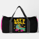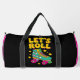 This black and pink duffle bag is perfect for roller skating enthusiasts, featuring a vibrant, rainbow-themed roller skate design with stars and a heart, and the playful phrase "LET'S ROLL." It's an ideal accessory for carrying skates, gear, or for a fun, retro-inspired outing. Edit colour of the bag caps and body in the Design tool to your favored colours.