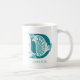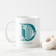 Customisable white coffee mug featuring the letter D in unique teal coloured typography. Add your name using the personalisation feature.