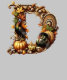 The design is a vibrant and festive representation of Thanksgiving, combining seasonal autumn elements with a playful cartoon turkey. At the heart of the image, the letter "D" stands out, adorned with vibrant leaves, pumpkins, and acorns, evoking a delicate autumnal atmosphere. Beside the letter stands a charming cartoon turkey, adding a touch of fun and personality to the design.